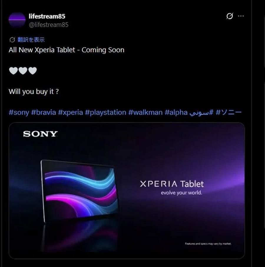 2015年,索尼推出了Xperia Z4 Tablet,这是品牌最后一款官方发售的Xperia平板电脑,当时凭借其超薄机身、防水设计以及高解析度屏幕获得了市场的高度认可。之后,索尼逐步退出了平板市场,将重点转向智能手机和影像传感器领域,至今已超过11年。不过,近日海外社交平台上有用户发布了一条名为“All New Xperia Tablet – Coming Soon”的帖子,暗示索尼可能将在2026年重返平板市场,时隔11年推出全新Xperia平板。