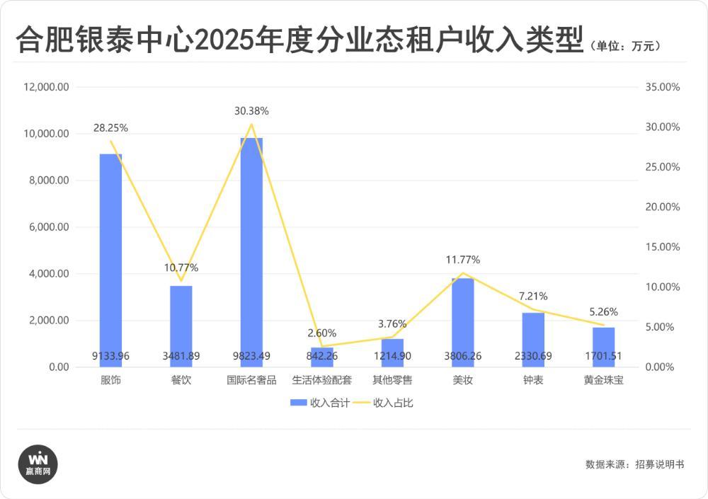 据招募说明书,截至2025年末,合肥银泰中心在营商户共计424个。从租赁面积分布看,项目成功构建了以服饰(30.77%)、餐饮(28.55%)、国际名奢品(16.73%)及生活体验配套(12.35%)为核心的业态组合。这组数据清晰表明,项目已超越传统重奢商场范畴,成为一个覆盖时装、美食、奢品与休闲体验的完整生活空间,为其“区域生活方式中心”的定位提供了扎实的支撑。