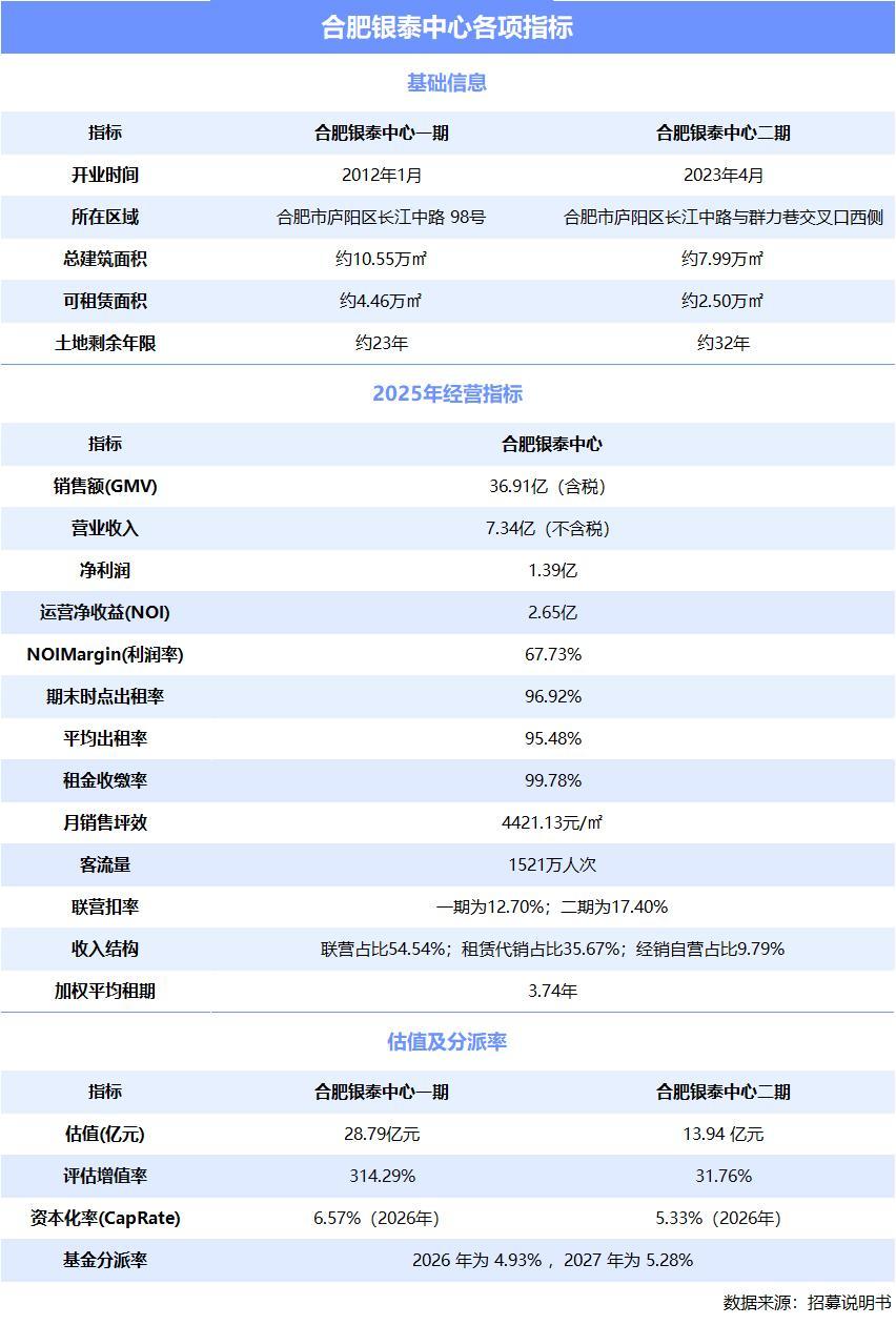 2026开年,华夏银泰百货封闭式商业不动产证券投资基金正式向上交所提交申报并获受理。该基金底层资产为银泰商业旗下的合肥银泰中心一期及二期项目,拟募集规模42.785亿元,2026年及2027年度预测现金分派率分别为4.93%和5.28%。
