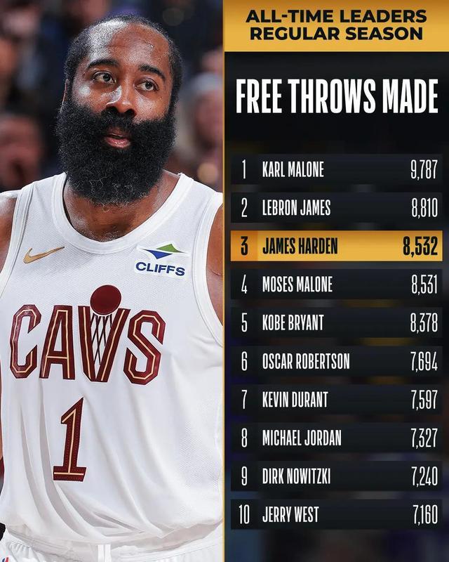 据统计,本场比赛过后,哈登生涯的总罚球命中数正式超越摩西-马龙,升至历史第三位,目前,只有勒布朗-詹姆斯和卡尔-马龙职业生涯的罚球命中数超过哈登。