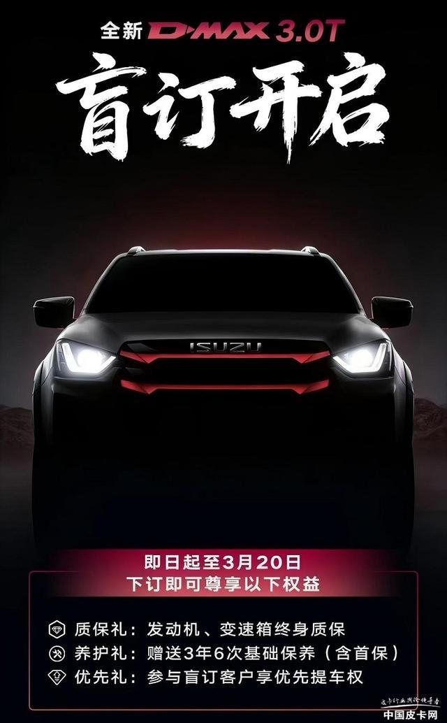 最重磅的莫过于江西五十铃即将推出的3.0T D-MAX这台车了,这也是大家盼望已久的搭载全新的代号为4JJ3发动机的版本。春节前该车已经开启盲订并有多重权益,预计将会在3月20日上市。
