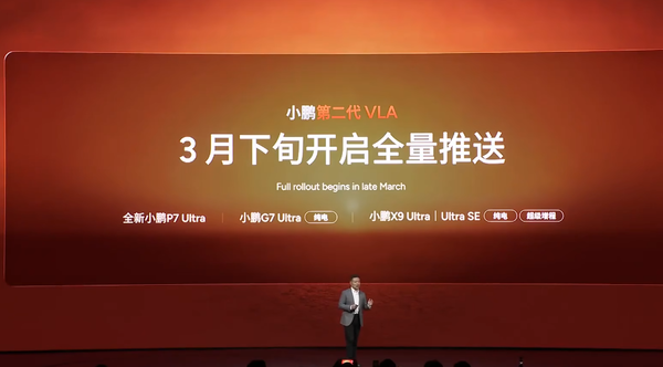 【CNMO科技消息】3月2日,小鹏汽车正式发布第二代VLA智能驾驶系统。何小鹏宣布将于3月下旬至4月分阶段向旗下多款车型推送升级。首批覆盖全新小鹏P7 Ultra、小鹏G7 Ultra(纯电版)、小鹏X9 Ultra及Ultra SE(纯电/超级增程版)三款车型,2026款小鹏P7+ Ultra/Ultra SE、小鹏G9 Ultra/Ultra SE、小鹏G6 Ultra/Ultra SE及小鹏G7 Ultra/Ultra SE(超级增程版)则将于4月开启全量推送。