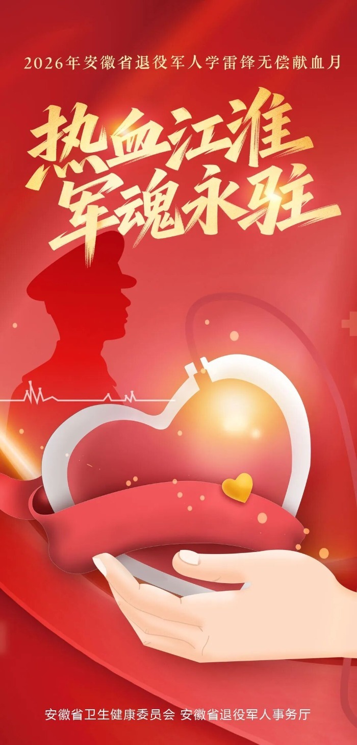 大皖新闻讯 为弘扬雷锋精神,激励全省退役军人奉献爱心,有效保障临床用血需求,近日,安徽省卫健委与安徽省退役军人事务厅联合印发《关于组织开展2026年安徽省退役军人学雷锋无偿献血月活动的通知》(以下简称《通知》),于3月在全省范围内开展以“热血江淮 军魂永驻”为主题的无偿献血月活动。