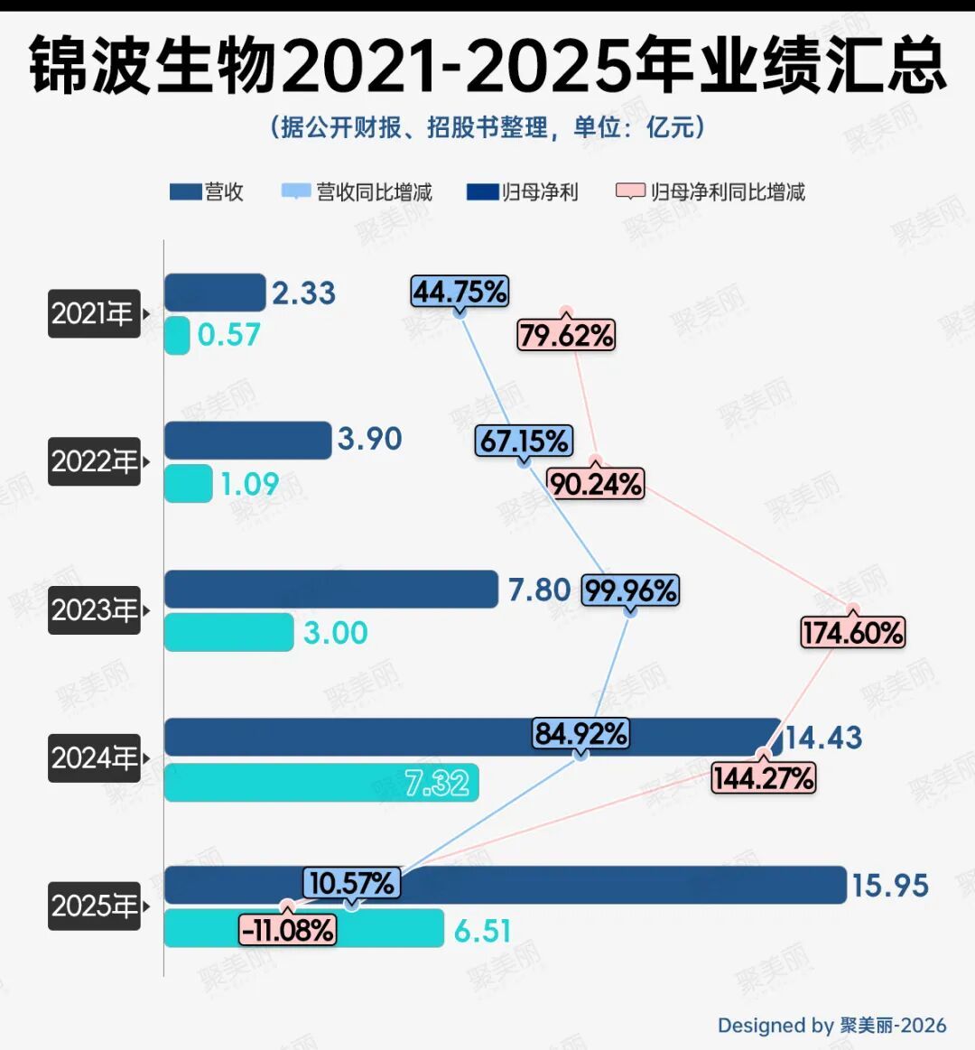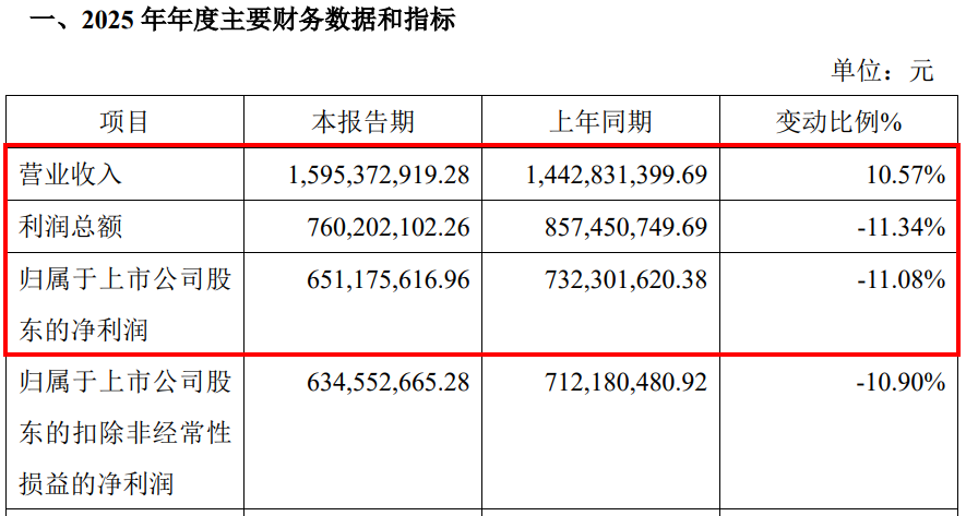 财报显示,锦波生物2025年营收为15.95亿元,较2024年同比增长10.57%;利润总额则同比下滑11.34%至7.60亿元;而归母净利为6.51亿元,同比下跌11.08%。