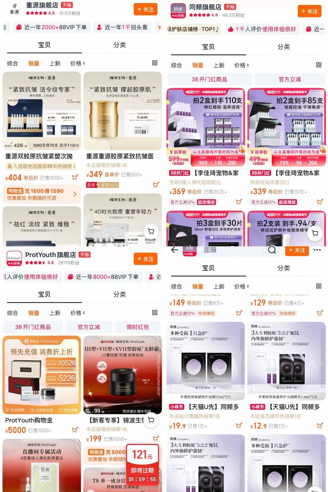 近年来,锦波生物虽有意补齐品牌化不足的短板,但仍任重道远。目前,其核心品牌重源、ProtYouth®在天猫旗舰店销量表现平平,爆款产品月销仅1000+。另外,锦波生物自2024年推出的新品牌同频,虽凭借绑定李佳琦、聚焦次抛与医美功效护肤赛道成为年度黑马,但其盈利模型能否跑通,以及真正实现规模化与品牌化,仍有待市场进一步验证。