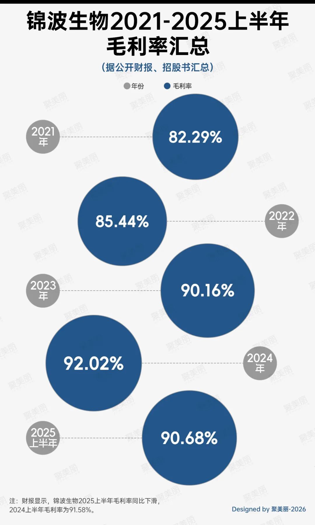 而对比2021-2025上半年毛利率变化来看,锦波生物的综合毛利率在2025年呈现下滑,其2025上半年毛利率为90.68%,较2024上半年下跌一个点。
