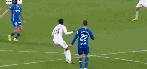 第90+5分钟,维尼修斯着急搬起受伤对手,被主裁黄牌警告