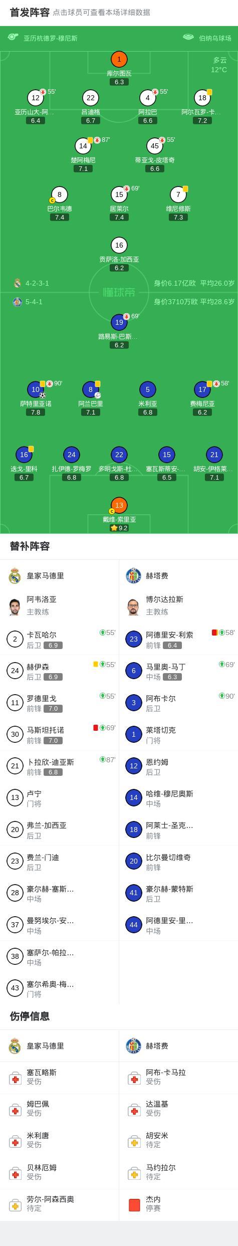 北京时间3月3日西班牙足球甲级联赛 联赛 第26轮,皇家马德里主场对阵赫塔费。上半场,维尼修斯单刀射门被门将挡出。随后,萨特里亚诺凌空抽射破门。下半场最后时刻,马斯坦托诺和利索相继被罚下。全场比赛结束,皇马0-1不敌赫塔费。