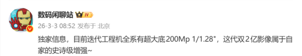 【CNMO科技消息】3月3日,数码博主“数码闲聊站”爆料称,目前有一款迭代工程机全系搭载超大底2亿像素主摄。根据网友猜测,这款手机为小米18系列。