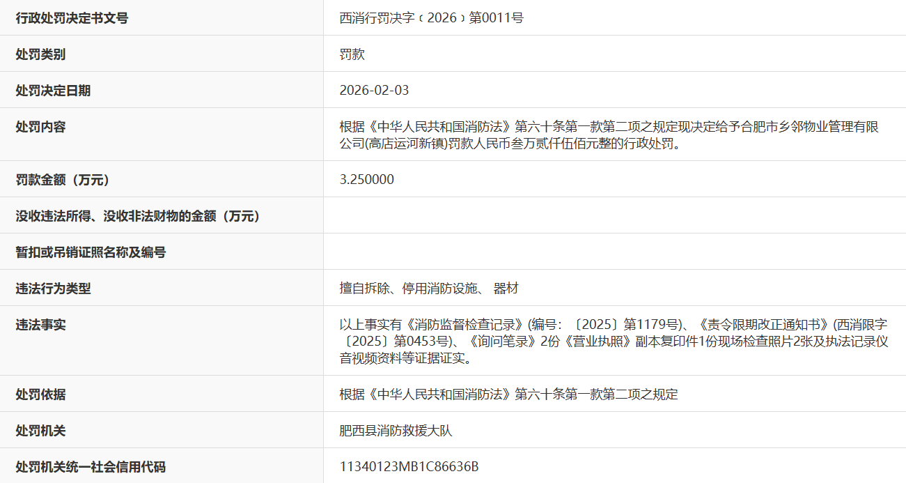 近日,据“信用安徽”公开披露行政处罚信息,因擅自拆除、停用消防设施、 器材,合肥市乡邻物业管理有限公司被处以罚款3.25万元。行政处罚决定书文号是西消行罚决字﹝2026﹞第0011号。