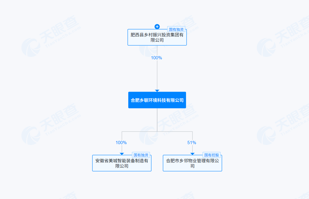 从股权结构全景图来看,合肥市乡邻物业管理有限公司由合肥乡联环境科技有限公司控股,而合肥乡联环境科技有限公司则为肥西县乡村振兴投资集团有限公司全资子公司。