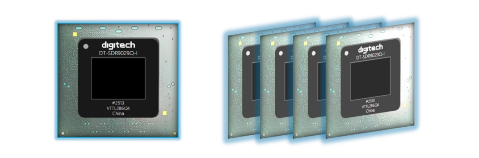 DT-SDR9029系列是一款高性能多通道宽带射频收发系统级芯片,产品直接对标国际头部企业的高端芯片系列,可实现硬件兼容与功能性能替代。在工艺与性能层面,该芯片采用全自主国产14nm CMOS先进制程流片,具备70MHz至7.125GHz全频段覆盖能力,可适配从短波到微波的多频段通信需求,支持高达400MHz的瞬时带宽,满足新一代宽带通信技术的严苛要求,拥有4通道发射、4通道接收、1通道观察接收的完整通道配置,可适配复杂应用场景。芯片集成多通道收发前端、频率合成器、数字滤波及高速数据接口,是当前国内射频收发芯片中制程先进、集成度高、全国产化自主可控的产品之一。