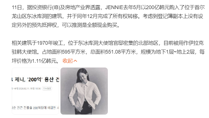 据悉,Jennie以200亿韩元(约合1.1亿元人民币)的价格,全款购入首尔龙山区东冰库洞一整栋建筑,并于去年12月完成产权过户。
