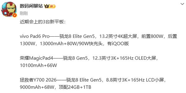 【CNMO科技消息】3月3日,CNMO注意到,据博主“数码闲聊站”透露,2026年3月,安卓平板市场迎来新一轮产品迭代。vivo、荣耀、联想三大品牌均计划推出搭载旗舰移动平台的新品,覆盖大屏、超薄及小尺寸游戏等细分市场。