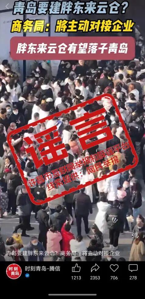 近日,某平台账号“时刻青岛”发布视频称“胖东来云仓有望落子青岛”。经核实,许昌市胖东来商贸集团有限公司目前暂无河南省郑州市、许昌市、新乡市三地外其他区域的建仓和开店计划。网传信息为谣言。