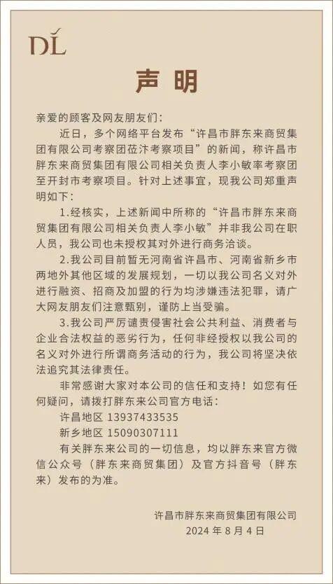 据了解,胖东来已于2024年公开发布声明,明确企业发展布局,相关信息以公告内容为准。