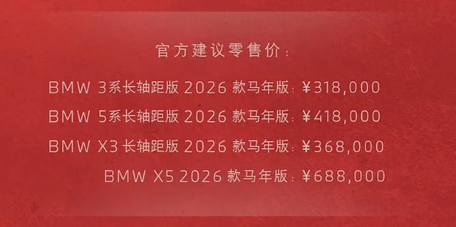 日前,宝马3系/5系/X3/X5 2026款马年版上市正式上市,其中,3系长轴距版2026款马年版售价为31.80万元;5系长轴距版2026款马年版售价为41.80万元;X3长轴距版2026款马年版售价为36.80万元;X5 2026款马年版售价为68.80万元。此次,马年版车型主要是进行了个性化升级。