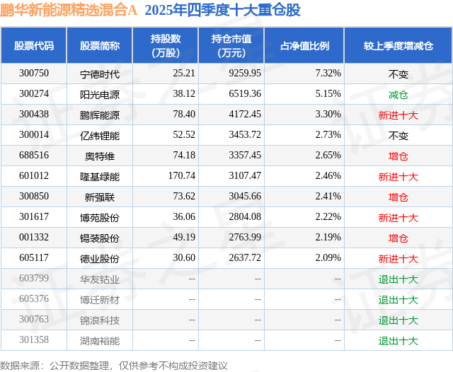 鹏华新能源精选混合A的前十大重仓股如下: