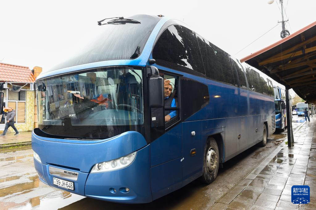 3月1日,在阿塞拜疆南部阿斯塔拉口岸外,前往巴库的免费大巴准备出发。