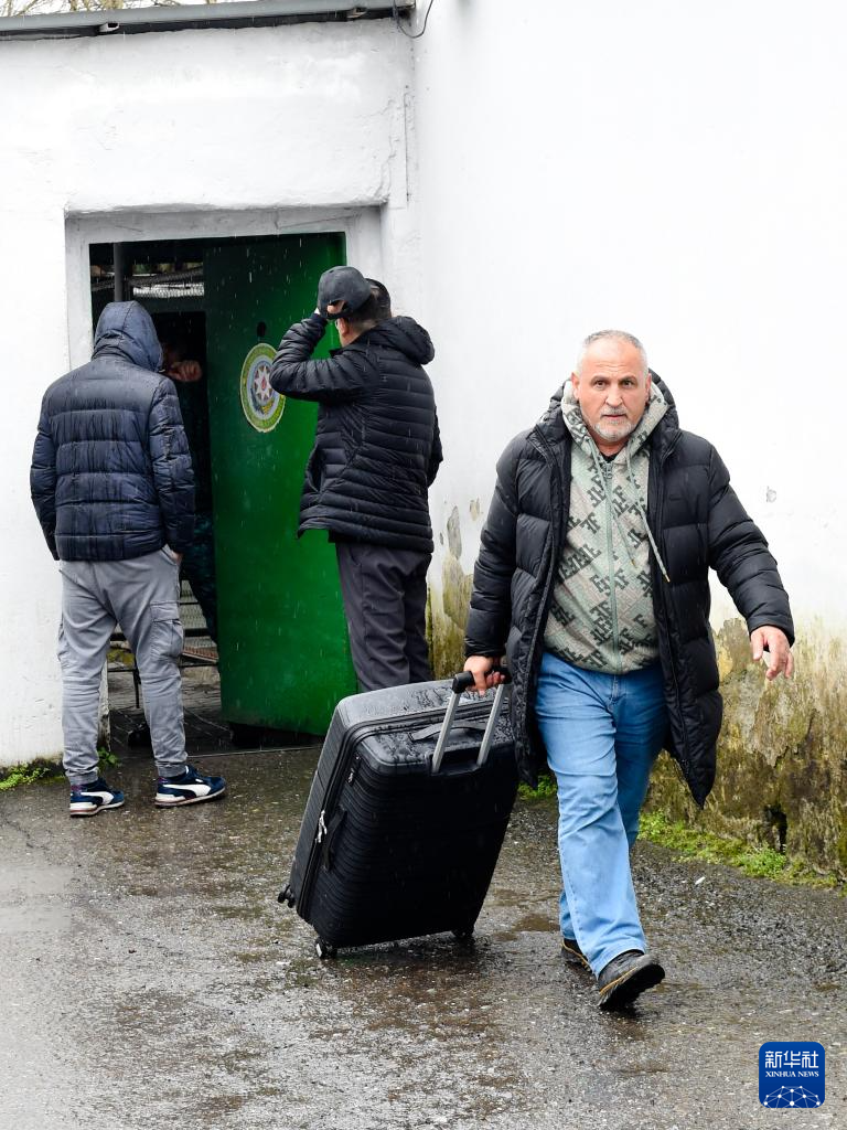 3月1日,在阿塞拜疆南部,一名从伊朗撤离的男子拖着行李走出阿斯塔拉口岸的铁门。