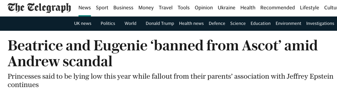 英媒日前获悉,前安德鲁王子的两个女儿——碧翠丝(Beatrice)公主和尤金妮(Eugenie)公主已经被王室通知,禁止参加今年6月举行的Ascot皇家赛马活动。