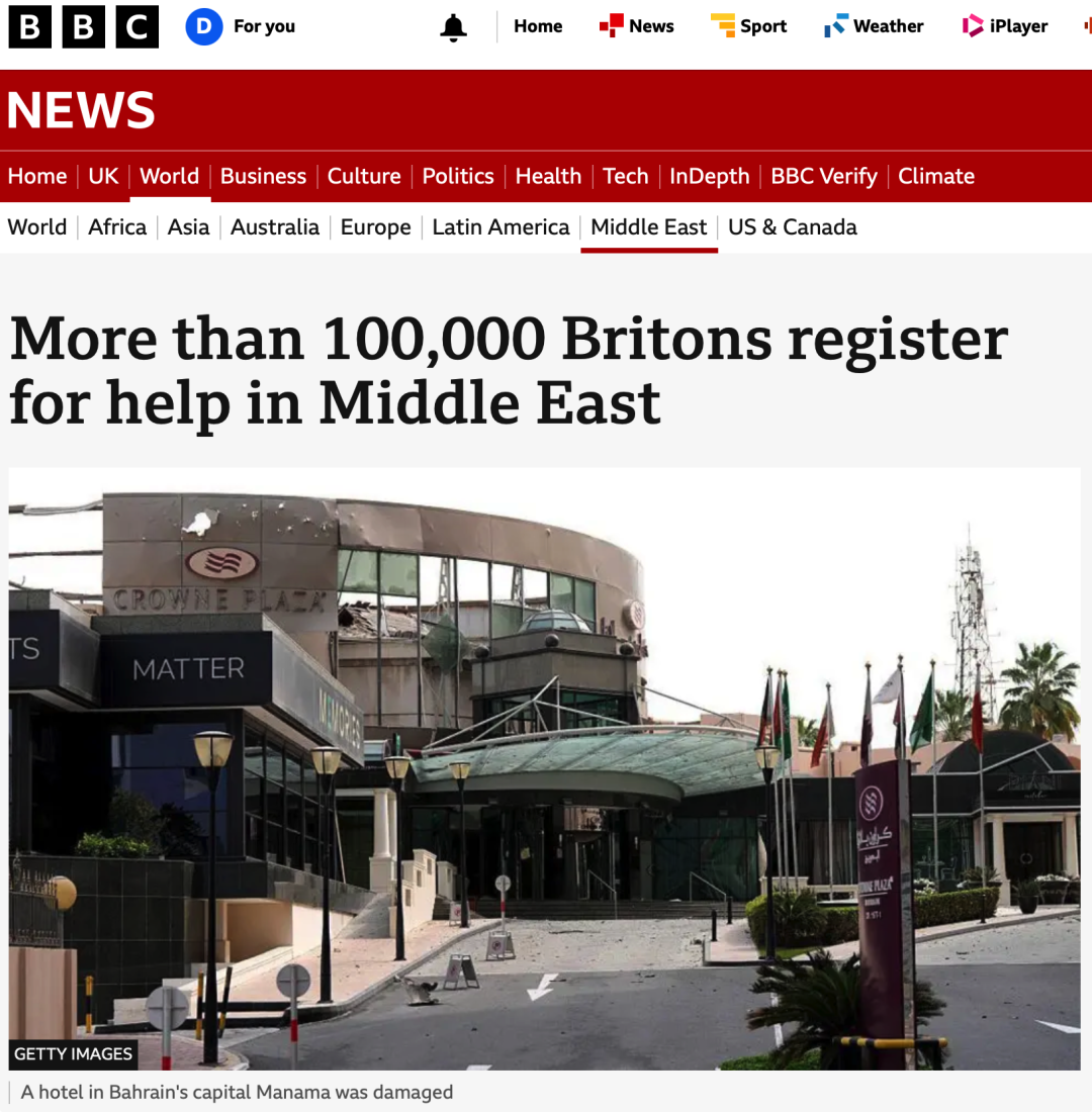 3月2日,英国外交大臣库珀在接受BBC采访时表示,目前估计有30万英国公民身在中东地区,其中大多数为度假者、过境旅客或商务访客。截至库珀接受采访的当天,已有10.2万名英国人在政府的官方登记系统中登记了他们在中东地区的活动情况。