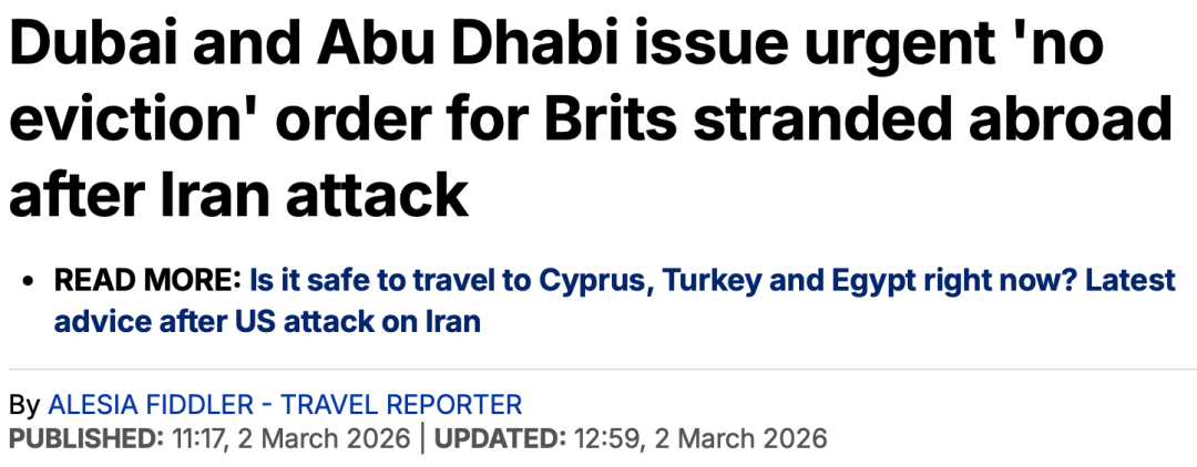 ● 截至最新:已有超10万名身在中东地区的英国人进行了登记,阿联酋迪拜阿布扎比通知酒店不得驱赶住客