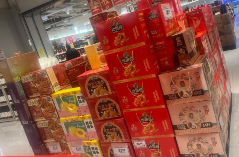 而在面包、八宝粥、饼干、糕点等品类中,即便无法直接做成“两箱一提”,品牌也会通过把包装做大、增强体量感的方式,来达到相近的视觉与礼数效果。与河南文化高度相似的皖北地区,超市货架的堆头上,也随处可见大规模“两箱一提”包装的零食礼盒。