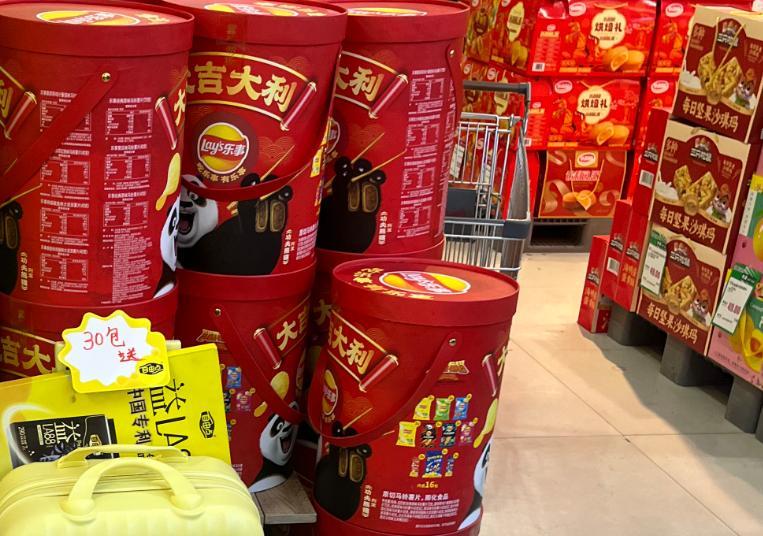春节期间,大包装零食正向多品类渗透,这是我们走访中最直观的消费体感。从旺旺零食大礼包、乐事大桶装组合,到“比脸还大”的果冻、妙可蓝多奶酪大礼盒、溜溜梅梅冻等,大包装正成为春节零食的主流形态。