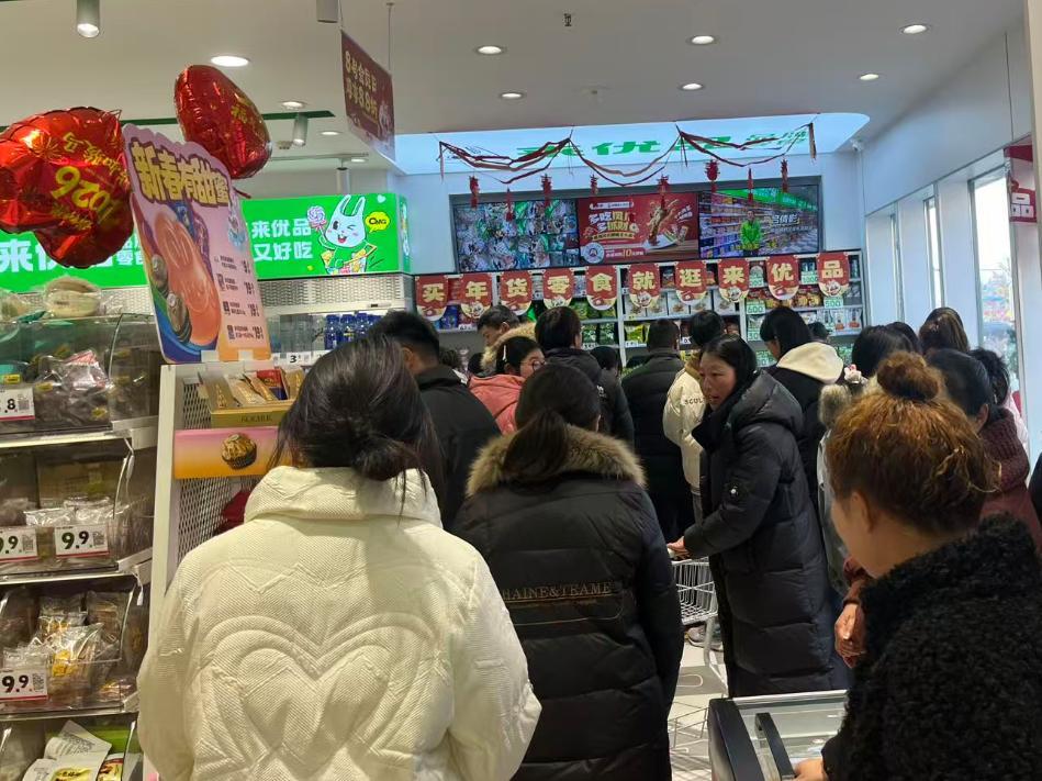 多重因素叠加,让零食折扣店迎来一波典型的“脉冲式增长”。但比增长更值得关注的是,春节带来人流洪峰,直接放大了渠道效率的差异。大年初一下午,我们在安徽界首市走访时看到,好想来旗下的来优品门店,在同一天呈现出截然不同的经营景象。