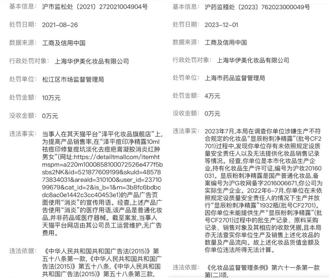 值得注意的是,其原主体上海华伊美早已是监管“常客”。2021年,因在电商平台使用“消炎”等医疗用语虚假宣传,被罚款10万元;2023年,因生产不合格祛痘产品、未按规定设质量安全负责人、无法提供销售记录,被处罚4万元。