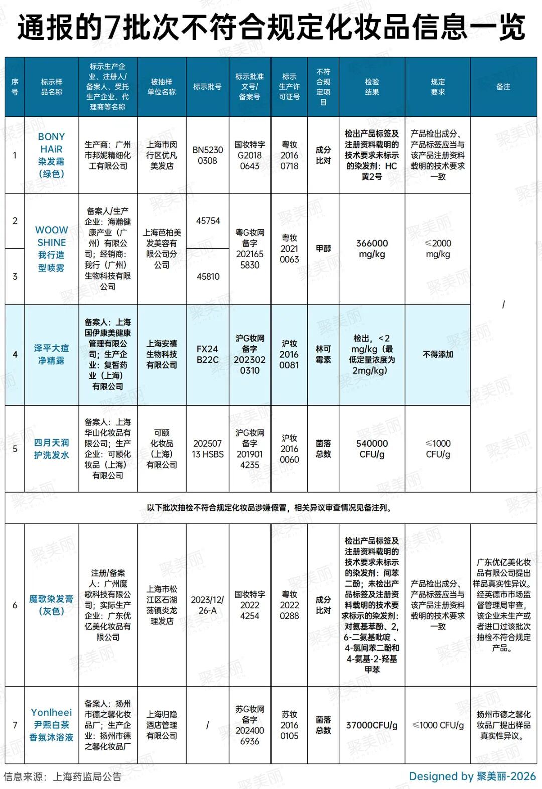 通告显示,有7批次化妆品不符合规定,其中值得注意的是,知名祛痘品牌泽平也因检出抗生素林可霉素赫然在榜。