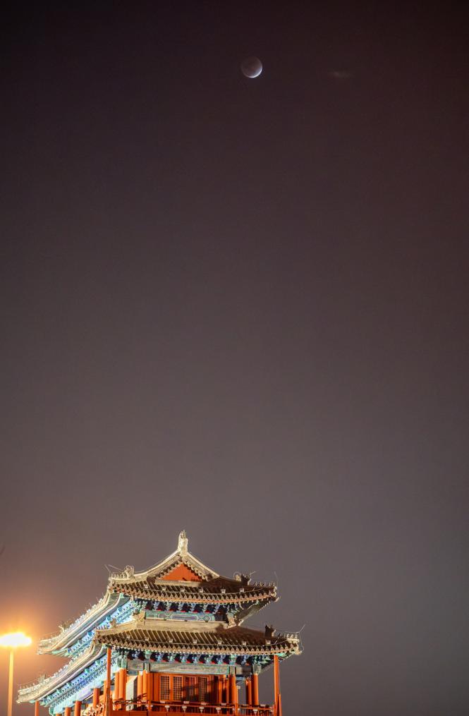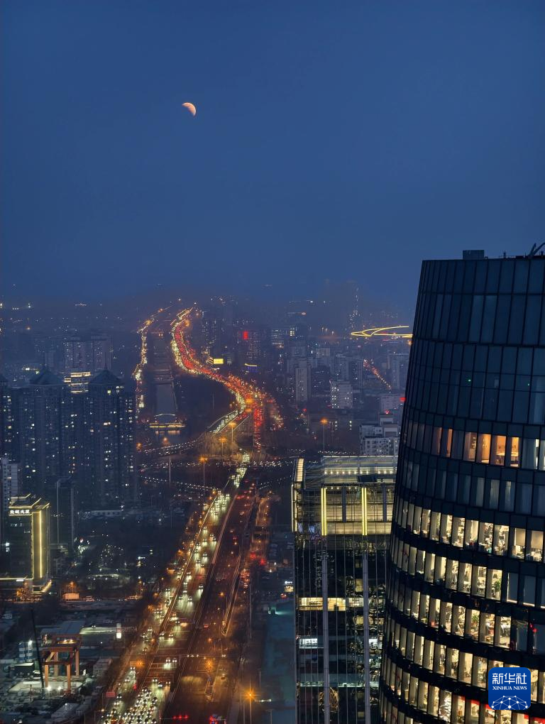 这是3月3日在北京国金大厦拍摄的月全食的生光阶段。