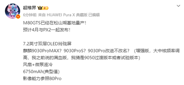 【CNMO科技消息】3月3日,博主“超维界”透露,华为最新性能旗舰Mate 80 GTS已在华为松山湖基地进入量产阶段,有望最快于4月与华为Pura X2一同发布。