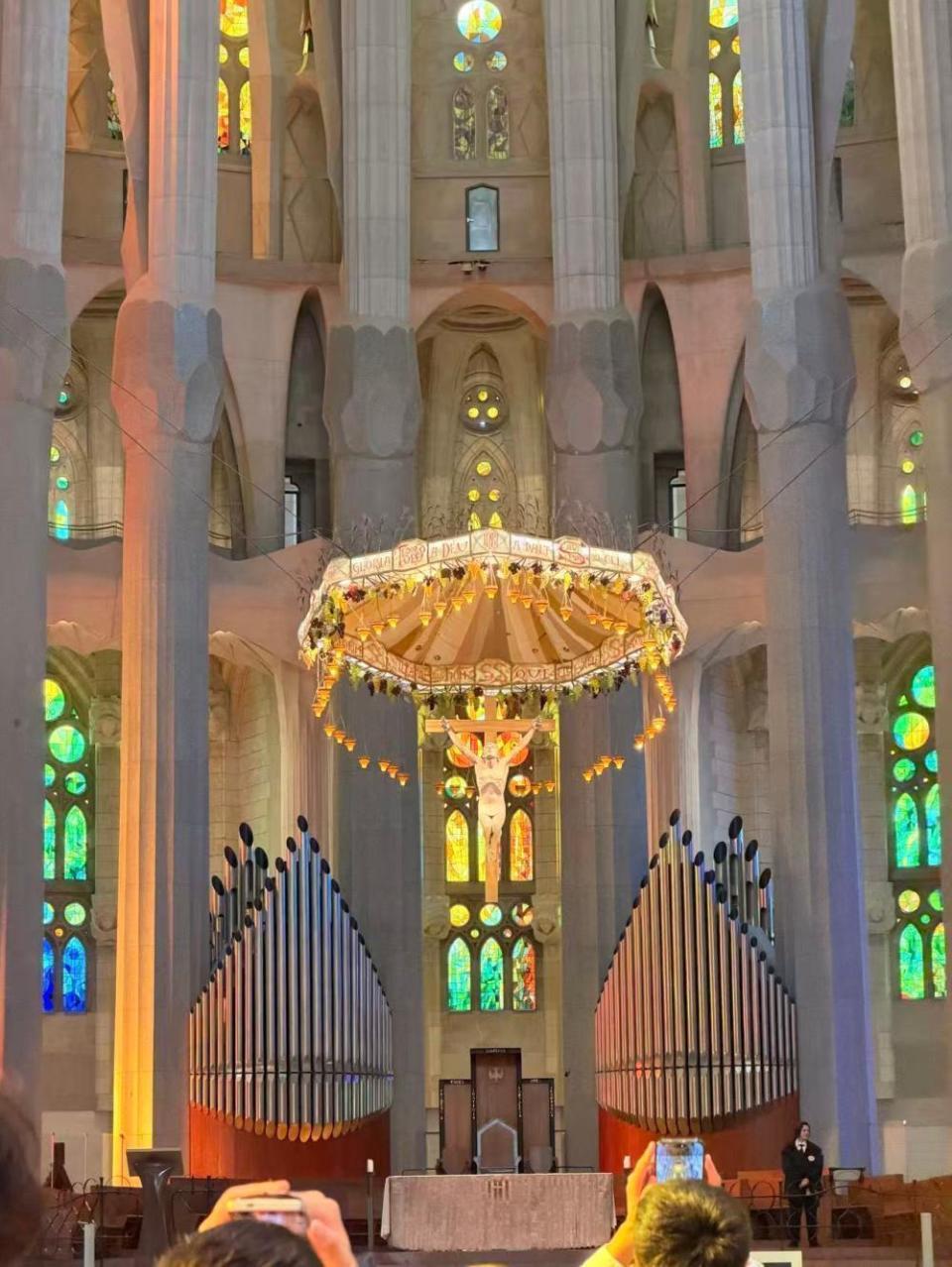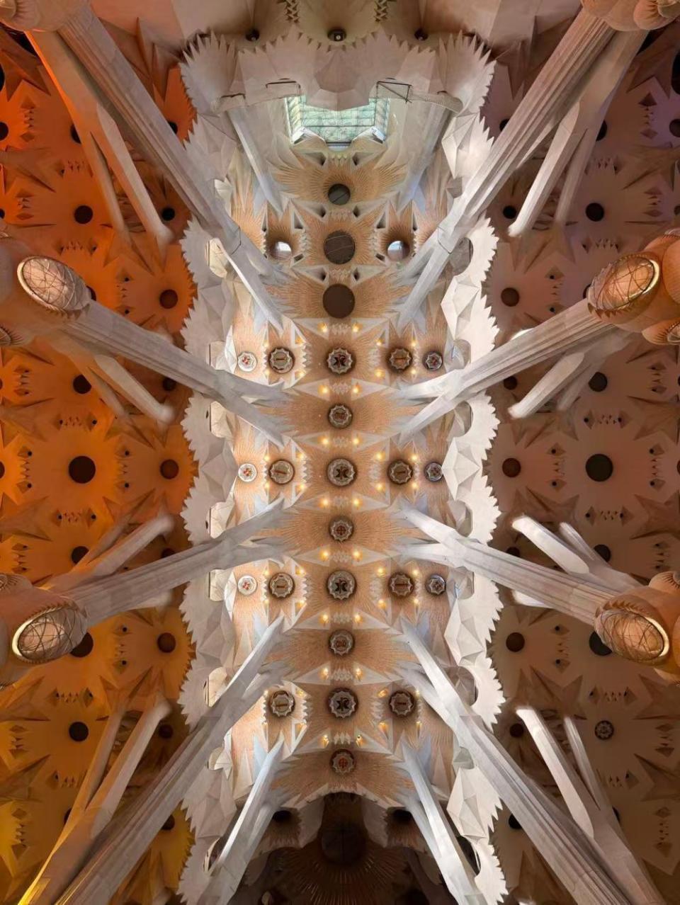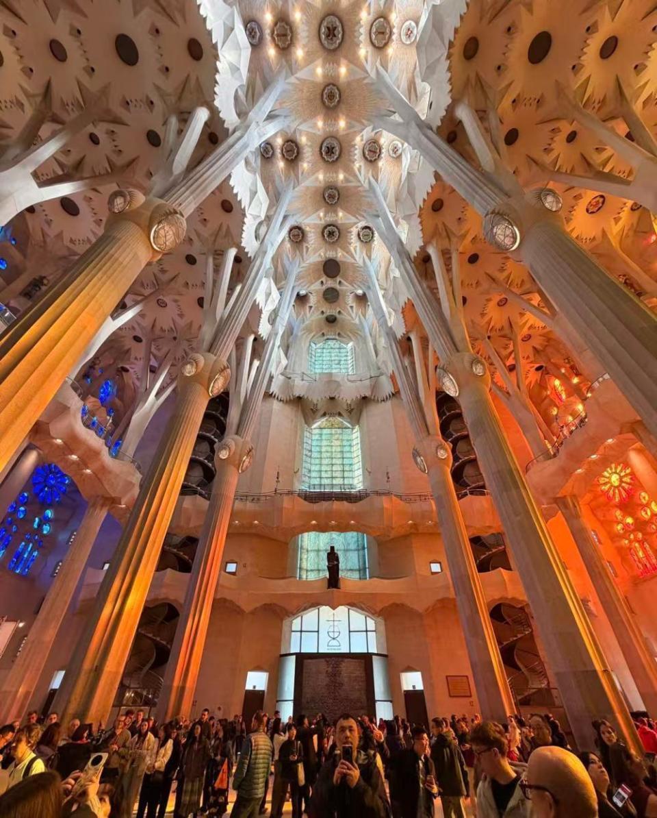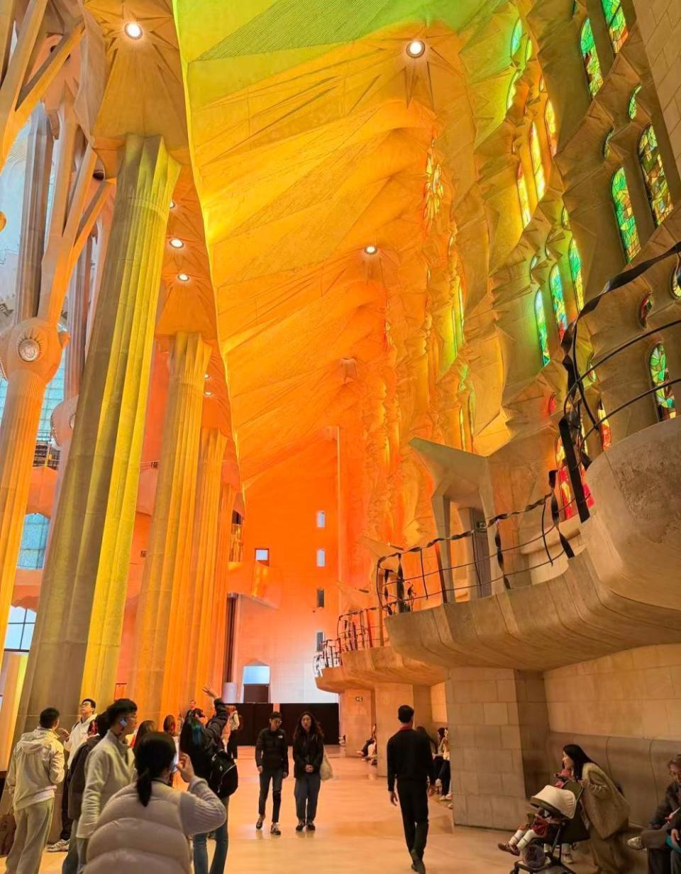 提起圣家堂,就不得不提它的几个“唯一”:首先,这是全世界唯一一个未完工即被列入世界文化遗产的建筑。2005年,联合国教科文组织将高迪诞生的立面、地下室以及部分已完成的核心区域列入《世界遗产名录》,这一殊荣彰显了其无可比拟的艺术价值。圣家堂并非传统意义上的宗教建筑,而是高迪将自然、宗教、几何与加泰罗尼亚文化深度融合的艺术作品。教堂内部没有一根直线,所有立柱均模仿树干、棕榈叶的形态向上延伸,阳光透过象征一年四季的不同色调的彩色玻璃窗洒入,营造出静谧而神圣的氛围。