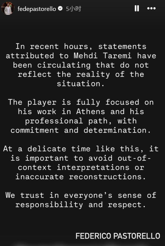 帕斯托雷洛表示:“近日流传的一些所谓塔雷米的言论,并不符合事实。球员目前完全专注于自己在雅典的工作与职业道路,保持承诺与决心。在这样一个敏感时期,避免断章取义或不准确的重构尤为重要。我们相信各方都能秉持责任感与尊重。”