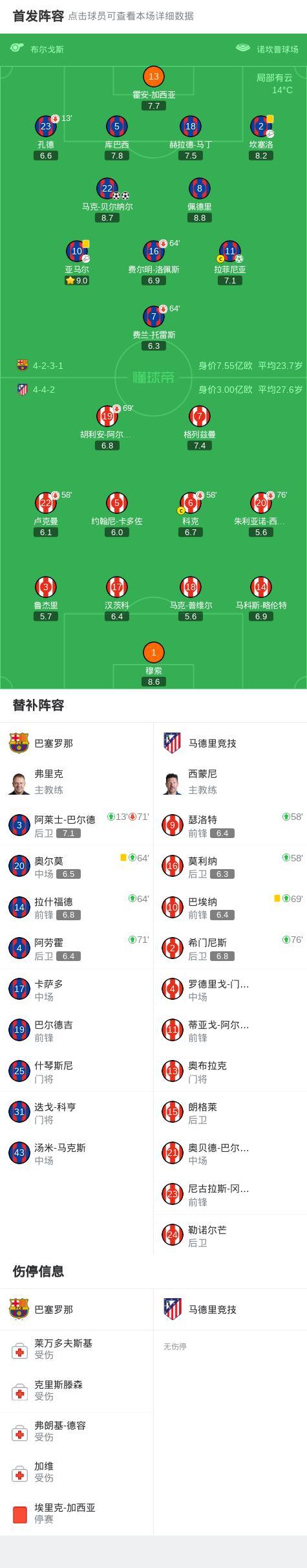 第13分钟,孔德早早伤退,巴尔德替补登场