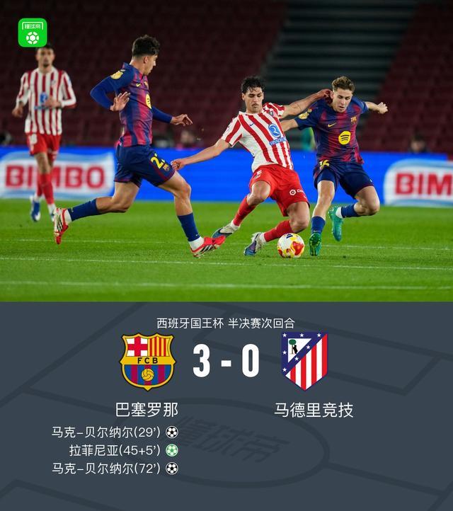 北京时间3月4日4:00,国王杯半决赛次回合,巴塞罗那坐镇Spotify诺坎普球场迎战马德里竞技,本场主裁判为布尔戈斯,首回合马竞主场4-0大胜。上半场,孔德开场伤退,亚马尔助攻贝尔纳尔破门,佩德里造点,拉菲尼亚操刀命中。下半场,贝尔纳尔再入一球梅开二度。最终,巴萨主场3-0马竞,总比分3-4无缘国王杯决赛。