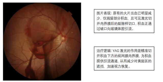 2.YAG激光治疗:当出血量大且遮挡黄斑时,医生会采用YAG激光在积血下方的视网膜内界膜上开一个微小切口,让积血引流到玻璃体腔,从而快速解除对黄斑的遮挡,加速视力恢复。
