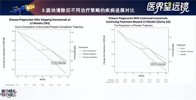 对于采用“清斑后停药”策略的多奈单抗,在排除“幸存者偏差”(即能停药的患者本身基线病情更轻、进展更慢)后,其停药患者在12-18个月的观察期内,疾病进展速度较匹配的安慰剂组仅减慢了17.4%。这表明,尽管清斑治疗带来了部分维持性获益,但疗效的持续性较弱,一旦停药,新获益便不再累积。而对于持续治疗的仑卡奈单抗,同样聚焦12-18个月期间,持续用药患者的疾病进展减慢幅度高达28.8%,相比多奈单抗的停药维持效果,其获益幅度提高了66%。