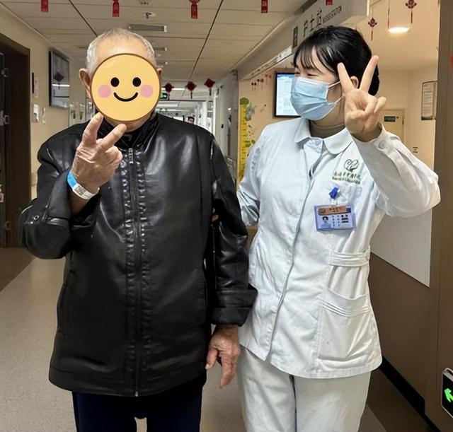 在岳阳市中医医院呼吸与危重症医学科的走廊上,一幕暖心画面被捕捉:86岁的刘爷爷(化名)在护士杨李的搀扶下缓缓踱步,走着走着,老人突然停下脚步,笑着比出“耶”的手势,那份孩童般的天真,让平凡的走廊多了几分温情。