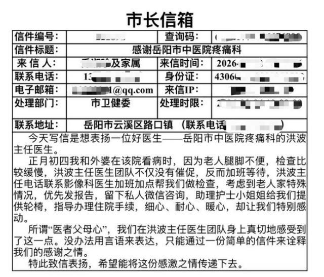 “医者父母心,在洪波主任团队身上,我们真切感受到了这一点。”近日,岳阳市中医医院疼痛科洪波主任团队收到市长信箱转来的一封特殊感谢信。信中字字真挚,记录了一段发生在春节假期的温暖求医故事。