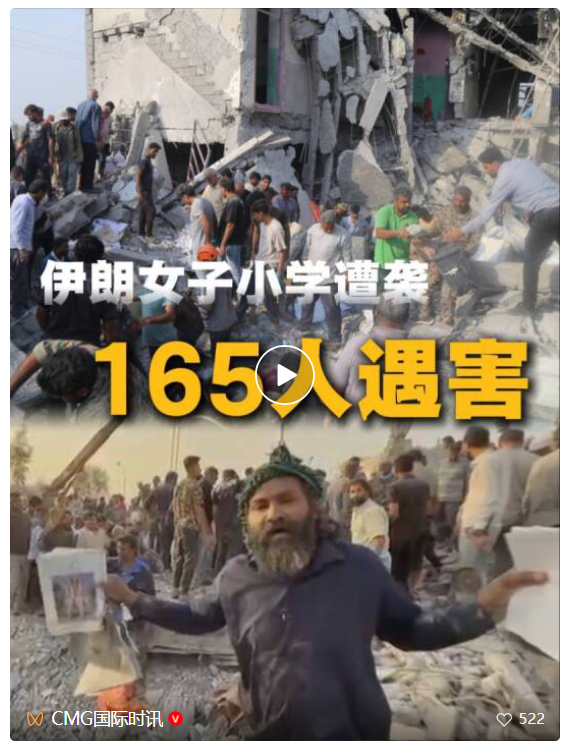 据CCTV国际时讯消息,美国和以色列2月28日发动的军事行动中遭袭的伊朗小学死亡人数升至165人,另有96人受伤。有当地居民举着在学校废墟里拾到的课本对总台记者表示,这些书上沾满了学生的鲜血,以色列再次向全世界证实其罪行,全世界必须看到这些画面,必须知道真相。