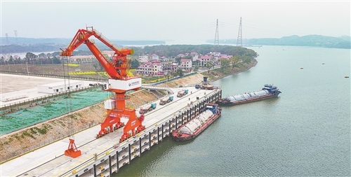 近年来,万安县开发利用赣江航道发展内河航运,打通内陆地区出海通道,助力经济发展。图为3月4日,万安下村综合货运码头门座起重机作业现场。 通讯员 林海宾摄