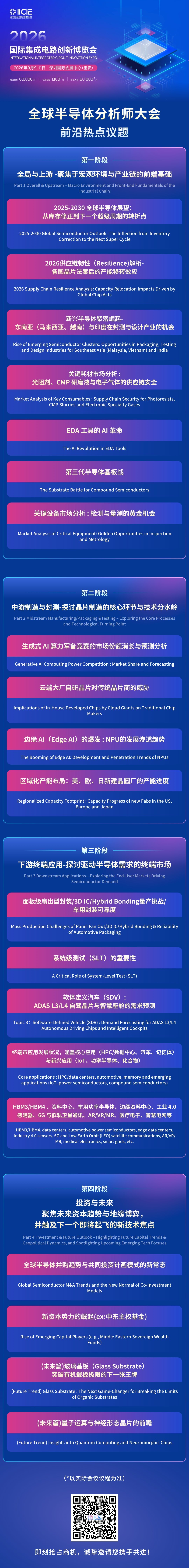 在“投资与未来发展”主题板块,全球顶尖投资领域分析师将联动头部创投机构,深度挖掘2026-2030年半导体产业的结构性投资机遇,重点解读算力芯片、HBM、化合物半导体等热门赛道的投资逻辑与商业模式创新方向。同时,针对后摩尔时代的技术演进,分析师们将探讨3.5D异质整合、混合键合、玻璃基板等核心技术的发展瓶颈与突破路径,预判未来核心技术与应用创新趋势,为企业技术研发与布局提供专业参考。