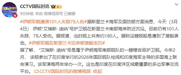 据斯里兰卡海军及国防部方面消息,今天(3月4日) 伊朗“艾瑞斯· 迪纳”号护卫舰在斯里兰卡南部海岸附近沉没。目前仍有101人失踪,78人受伤。据报道,当时舰上共有约180人。据称这艘舰船是遭到了潜艇袭击。