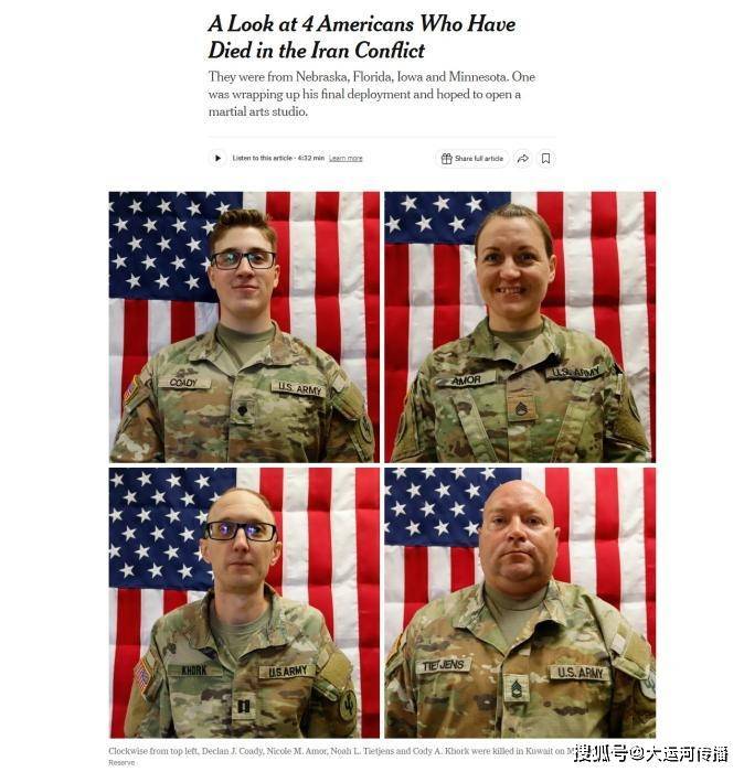 据美国《纽约时报》网站报道称,6名美军官兵在美国对伊朗军事行动中丧生,3日晚间,联邦官员公布其中四名遇难者身份,称他们均为陆军预备役军官,在科威特舒艾巴港遭遇无人机袭击时遇难。事件仍在调查中。
