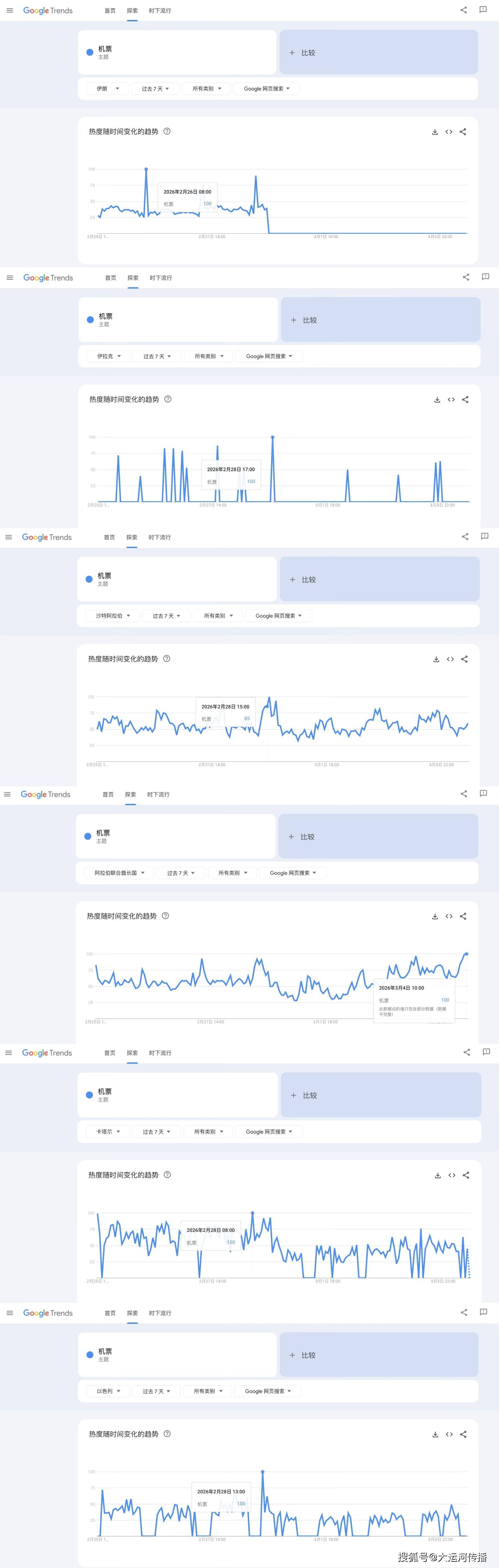 3月4日上午10时左右,记者查询谷歌趋势发现,过去7天,“机票”主题在伊朗、伊拉克、沙特阿拉伯、阿联酋、卡塔尔、以色列等地区搜索热度都曾达到最高值100。(吴家驹)