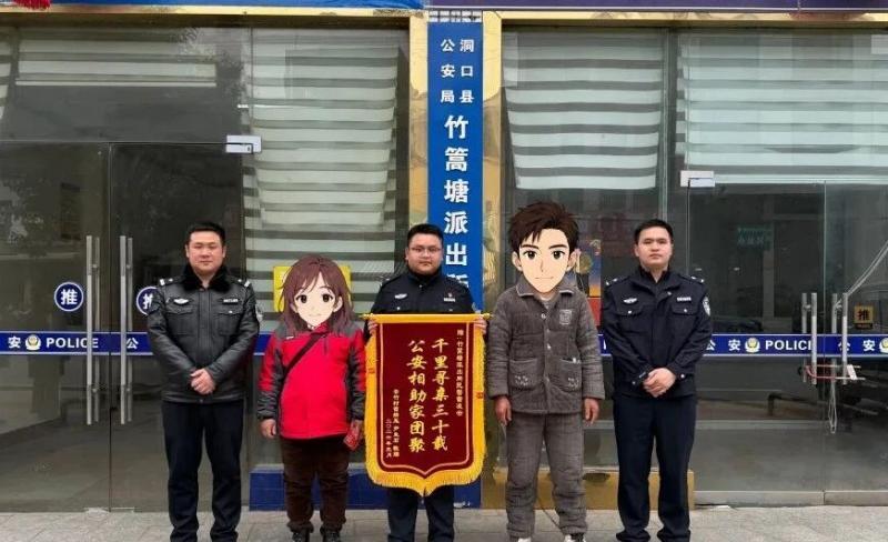 湖南省洞口县公安局通报称,3月3日,务工返乡过年的尹先生偕妻子付女士,专程再次来到洞口县公安局竹市派出所,将一面写有“千里寻亲三十载 公安相助家团聚”的锦旗送到民警曾凌云手中。