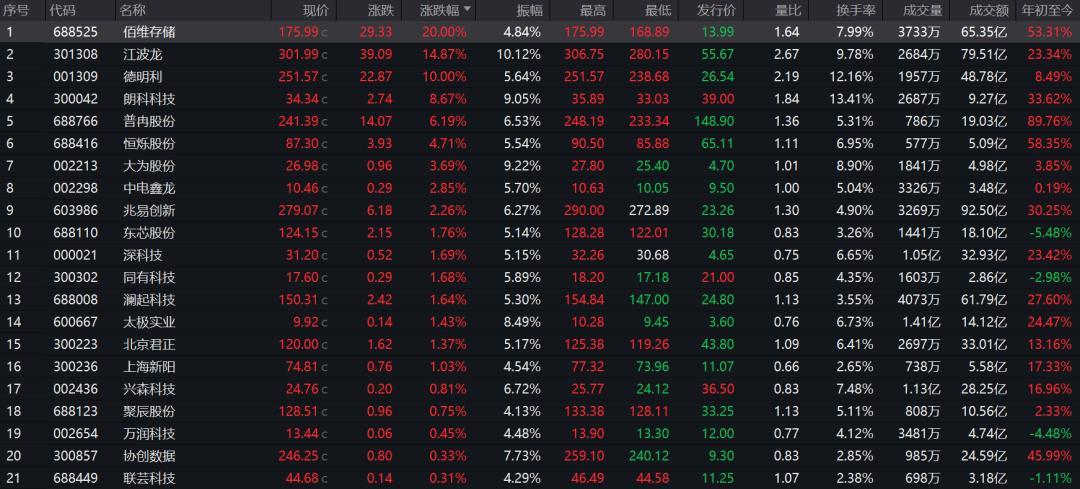 据Wind,从存储板块领涨个股来看,佰维存储、江波龙主要产品为半导体存储产品,覆盖消费级、车规级、工规级等应用场景;德明利产品线涵盖固态硬盘类、嵌入式存储类、内存条类及移动存储类;朗科科技产品覆盖SSD、DDR、嵌入式存储和移动存储等多个品类;普冉股份主要产品包括NOR Flash和EEPROM两大非易失性存储器芯片、MCU微控制器芯片及模拟产品;恒烁股份主营产品包括NOR Flash存储芯片、MCU芯片、AI芯片和嵌入式存储产品。